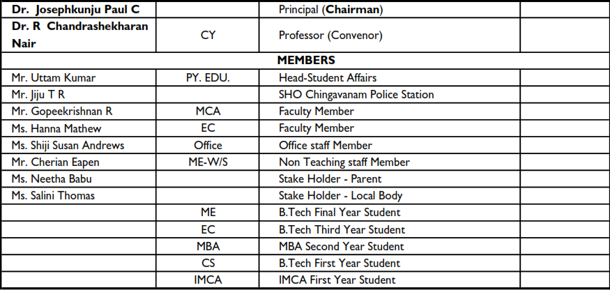 As per the regulations of University Grants Commission (UGC) to prevent the menace of ragging in Higher Educational Institutions, the following committee has been formed in SAINTGITS College of Engineering. Students can approach the committee members to register their complaints.