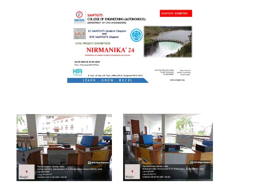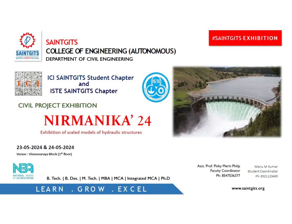 ICI Saintgits Student chapter organised a civil project exhibition ‘NIRMANIKA’ on 23rd and 24th May 2024 at Visvesvaraya (VB) block of Saintgits College of Engineering. The civil students of all semesters participated in the event. The event aimed to showcase the innovative projects developed by the students in the field of civil engineering, specially more on hydraulic structures. The event promotes the exchange of ideas and knowledge among students, faculty, and encourage creativity and practical application of engineering concepts. Overall, the project exhibition. The event demonstrated the dedication and commitment of the ICI Saintgits Students Chapter to promote learning, research, and practical application