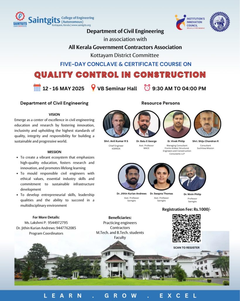 Department of Civil Engineering, Saintgits College of Engineering (Autonomous), in association with the All-Kerala Government Contractors Association, Kottayam District Committee is organising a Five-Day Conclave on the topic “Quality Control in Construction” from May 12 -16, 2025 in the VB Seminar Hall, Department of Civil Engineering, Saintgits College of Engineering (Autonomous).