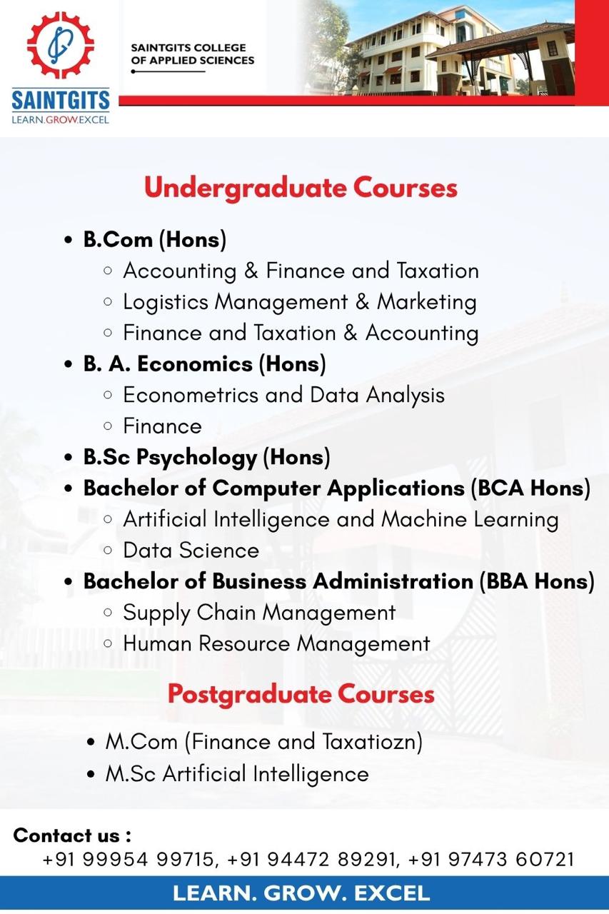 Saintgits College of Applied Sciences which is established in 2004 and affiliated to Mahatma Gandhi University, Kottayam, offers the following UG and PG programmes.