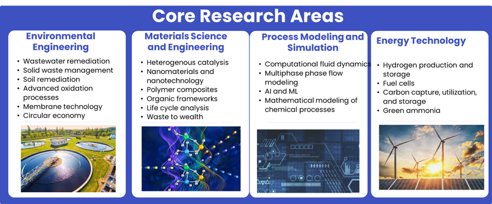 The Department of Chemical Engineering is committed to advancing high-quality, interdisciplinary research that addresses critical challenges in energy sustainability, environmental protection, advanced materials, and process systems engineering. By integrating fundamental science with applied engineering, our research ecosystem fosters innovation that contributes to both academic excellence and societal well-being. Our research activities are structured around four interconnected thrust areas: Energy, Environment, Materials, and Process Modeling and Simulation, enabling holistic solutions to complex, real-world problems. This integrated approach allows us to bridge laboratory-scale discoveries with scalable technologies, ensuring relevance across industrial, environmental, and policy-driven contexts. Strongly aligned with the United Nations Sustainable Development Goals (SDGs), our research emphasizes clean energy transitions, water and resource sustainability, pollution mitigation, and circular economy principles. Through national and international collaborations, funded research projects, and high-impact publications, the Department continues to strengthen its global research footprint while nurturing innovation-driven, socially responsible engineering solutions for a sustainable and resilient future.