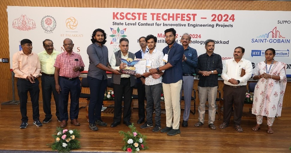 - The student team consisting of S Sivasree, Richu K Sunny, Joshua S Mathews and Varun R Nair [2020 -24 ME B Batch] under the guidance of Er. Liju Mathew Alexander won the 2nd prize (Gold Award) and a cash award of Rs. 25,000/- for their project work titled “Shock Stabilized Medicine Cooler” for the KSCSTE TECHFEST 2024, held at IIT Palakkad. The memento along with the cash prize were awarded by Dr. Saji Gopinath – Hon’ble Vice Chancellor of APJAKTU, in the presence of Dr. A Seshadri Sekhar – Director IIT Palakkad, Dr. Ajith Prabhu – Chief Scientist, KSCSTE and Dr. K P Sudheer – Executive Vice President, KSCSTE.