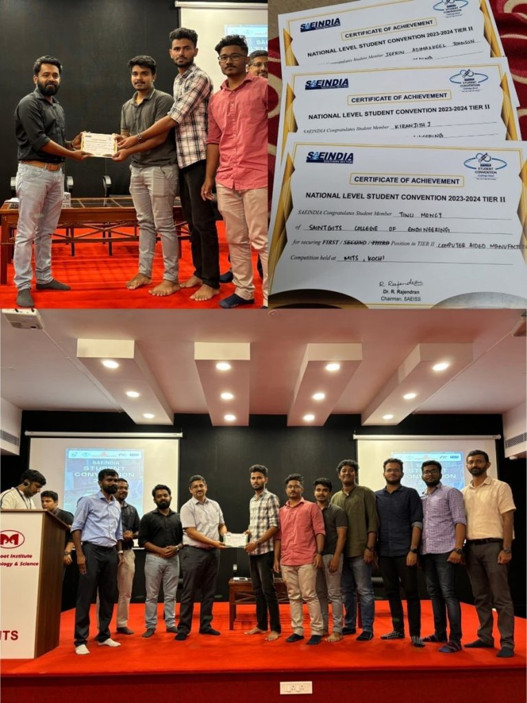 - Tinu Moncy, Kiranjith J and Jefrin Adimakkeel Johnson bagged First Prize in Computer Aided Manufacturing competition organized by SAEINDIA, for the NATIONAL LEVEL STUDENT CONVENTION 2023-24 TIER II, held at Muthoot Institute of Technology and Science, Kochi.