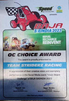 - BAJA – Team Striderz Racing of the department of Mechanical Engineering secured the OC Choice Award for the “Vision Board Challenge” competition organized by BAJA SAEINDIA 2023 held at Pithampur, Madhya Pradesh.