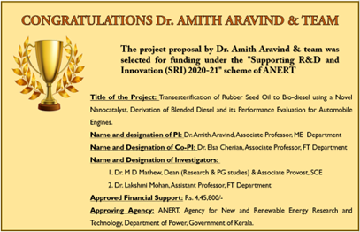 - The project proposal by Dr. Amith Aravind sanctioned for funding, Rs. 4,45,800/- under the “Supporting R&D and Innovation (SRI) 2020-21” scheme of ANERT.