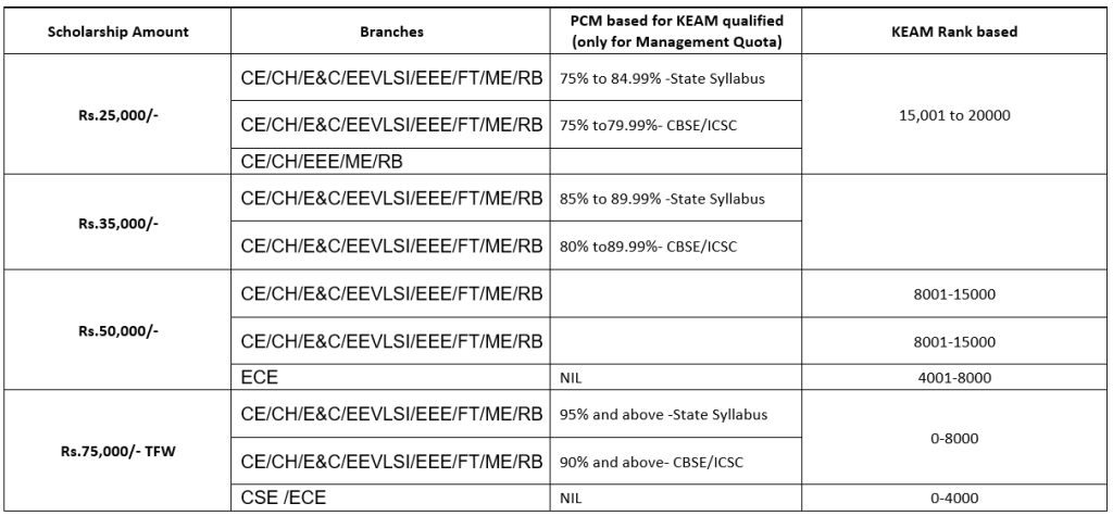 | Scholarships | Courses | CBSE / ICSE / ISC Board | Kerala State Board | KEAM Rank |
